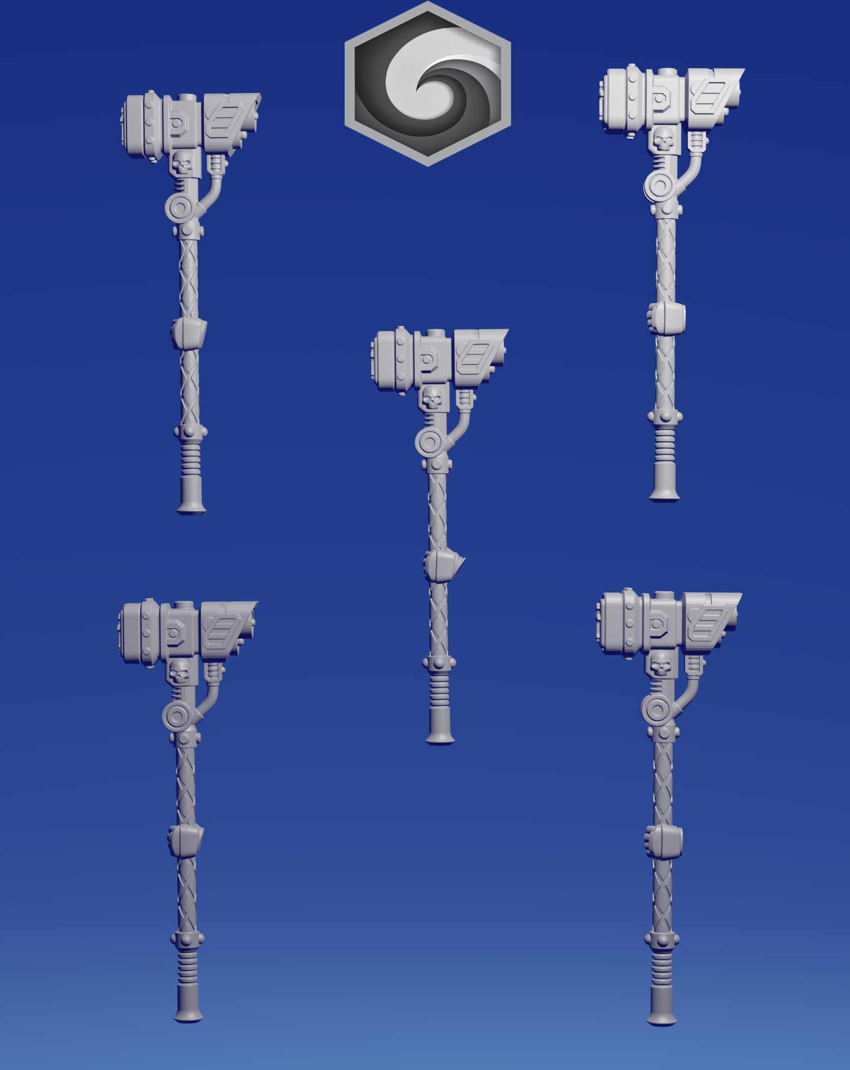 5 x 3D resin printed long-handled thunder hammers, with left hands, for sci fi soldiers.